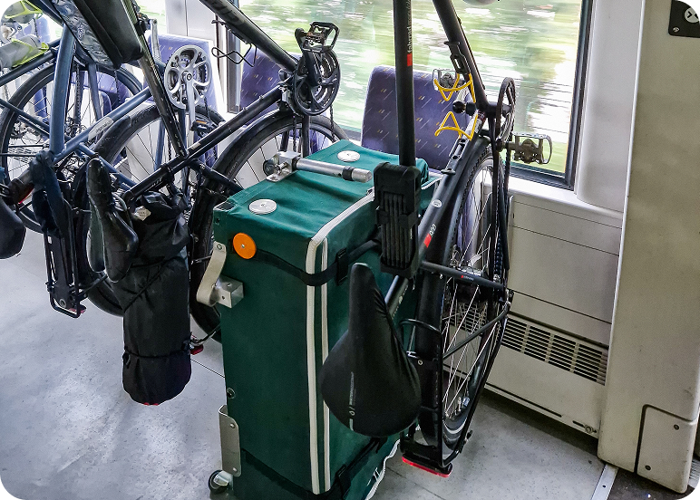 En format valise : 90 x 70 x 50 cm, seuls quelques trains l’accepteront dans un premier temps … mais les choses vont sûrement évoluer dans le bon sens au vu des politiques de mobilité douces mises en place par les gouvernements européens